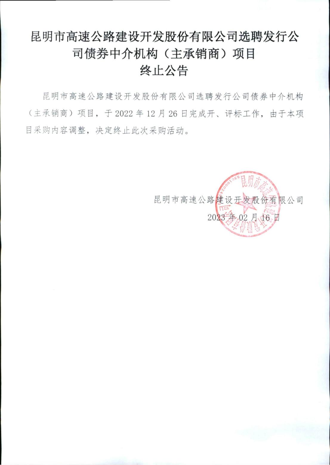昆明市高速公路建设开发股份有限公司选聘发行公司债券中介机构(主承销商)项目终止公告