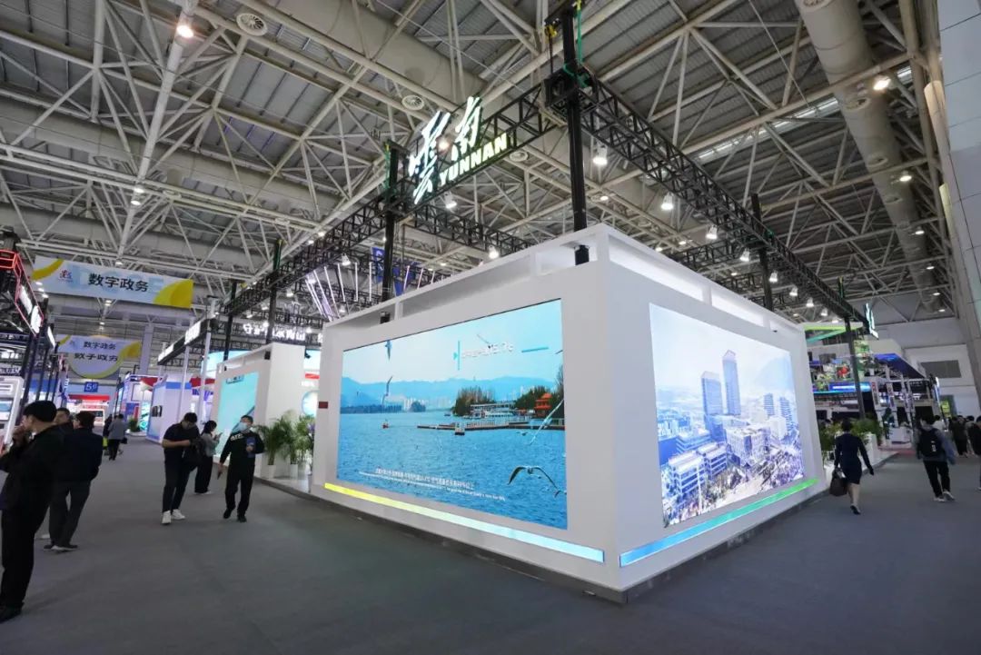 云南展位以“彩云之下有云南,云南数智有云端”为布展设计理念,按照推进数字技术与经济、政治、文化、社会、生态文明建设“五位一体”深度融合和“壮大资源经济、壮大口岸经济、壮大园区经济”进行策展构思,基于云端模块,结合“云”形式,分数字经济、数字政务、数字文化、数字社会、数字生态文明建设五大板块进行展示。