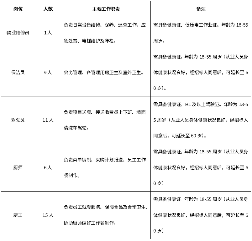 2.2招标范围:服务内容为保洁服务工作、物业日常维修服务工作(包含电梯维护及年检)、食堂服务工作、驾驶员服务工作(具体工作内容详见第五章《用户需求书》)。