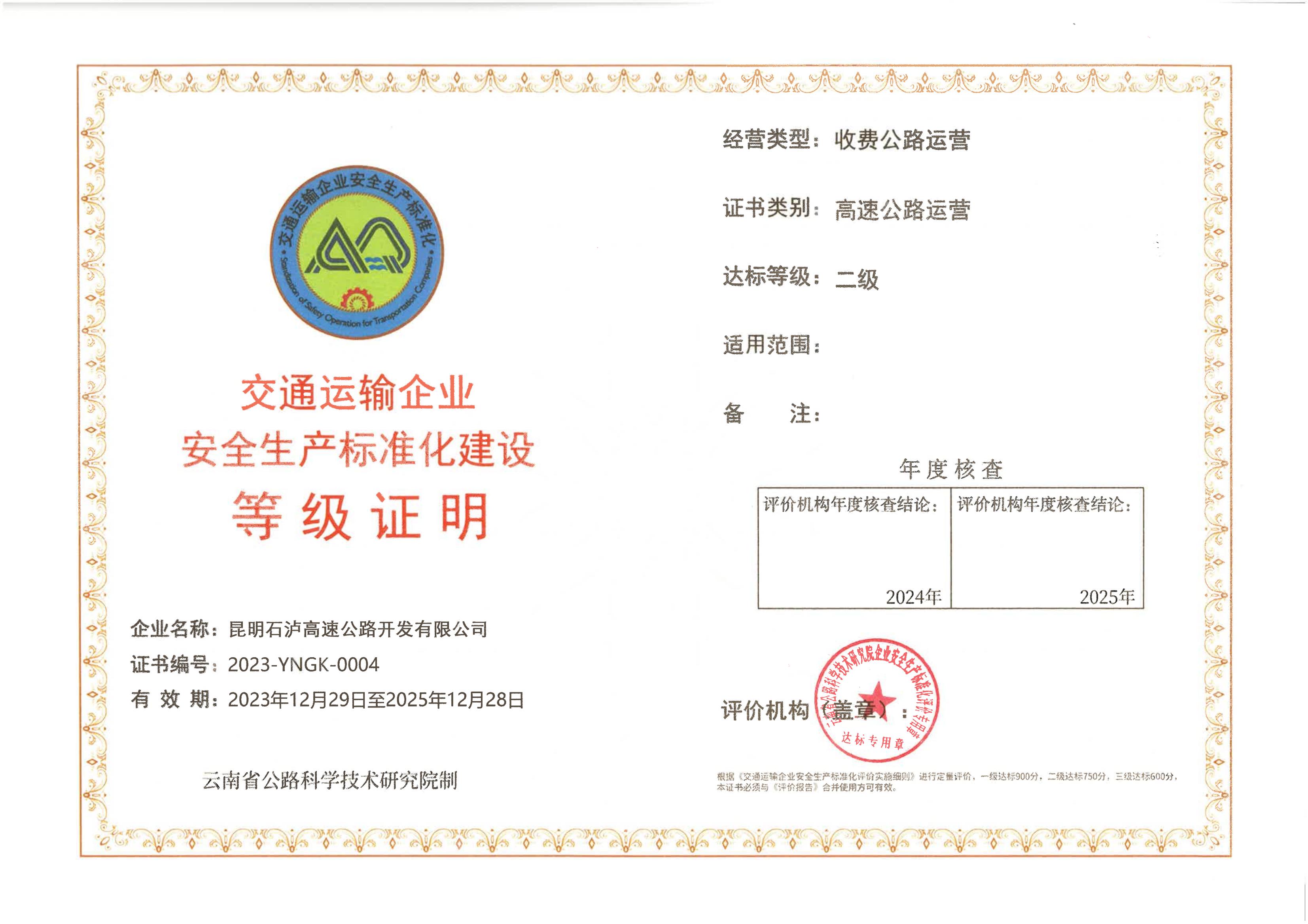 按照《昆明市高速公路开发建设股份有限公司安全生产标准化创建实施方案》的要求,宜石、石泸公司狠抓安全生产标准化建设工作不放松,近日,通过云南省公路科学技术研究院评审,宜石、石泸公司达到高速公路运营企业安全生产标准化二级标准,并获得“高速公路运营企业安全生产标准化二级”证书。