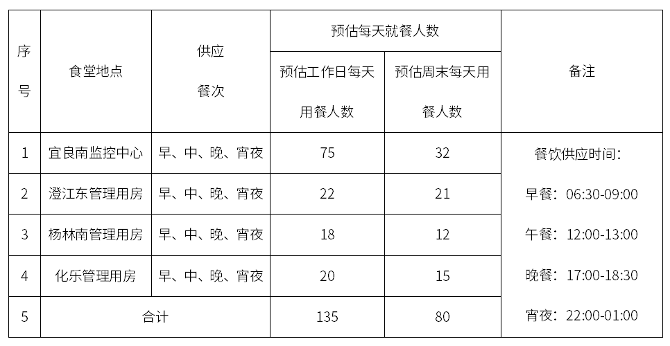 2.2项目概况:昆明东南绕城高速公路开发有限公司选聘2024年度食堂服务单位项目为东南绕城高速公路沿线四个食堂(化乐管理用房、澄江东管理用房、宜良南监控中心及杨林南管理用房)提供一日四餐的食堂服务,具体相关要求及情况如下:
