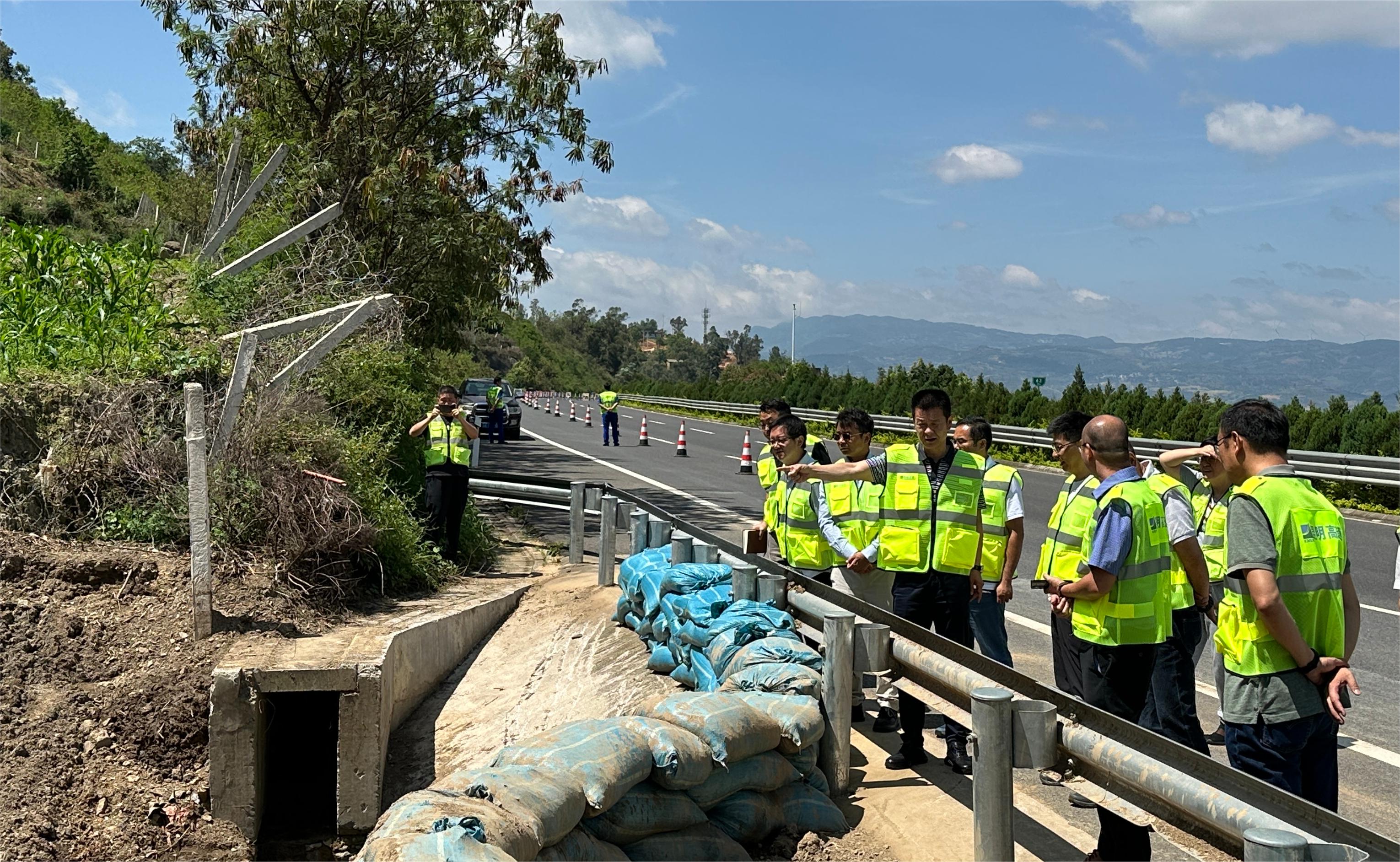 调研中,调研组一行实地查看东南绕高速澄江至宜良方向K62+096处冲刷泥水上路点,详细了解应急处置情况、处置过程以及防范措施。