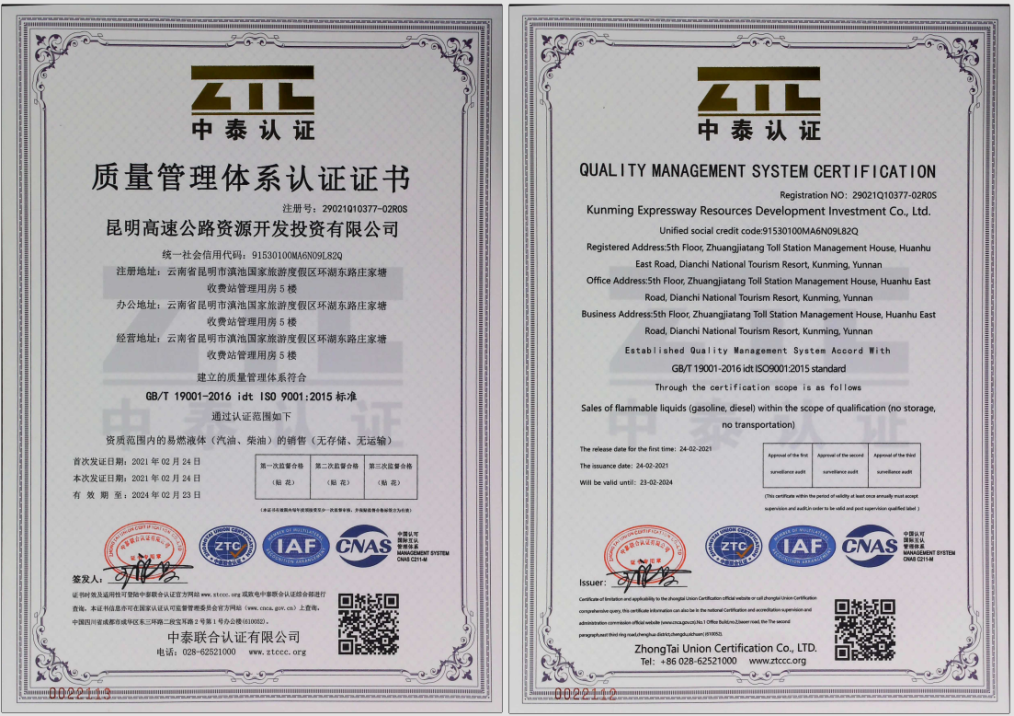 - 2021年3月9日,资源开发公司通过了中泰联合认证有限公司的监督审核,并取得了QES三体系(环境管理体系、质量管理体系、职业健康安全管理体系)认证证书。