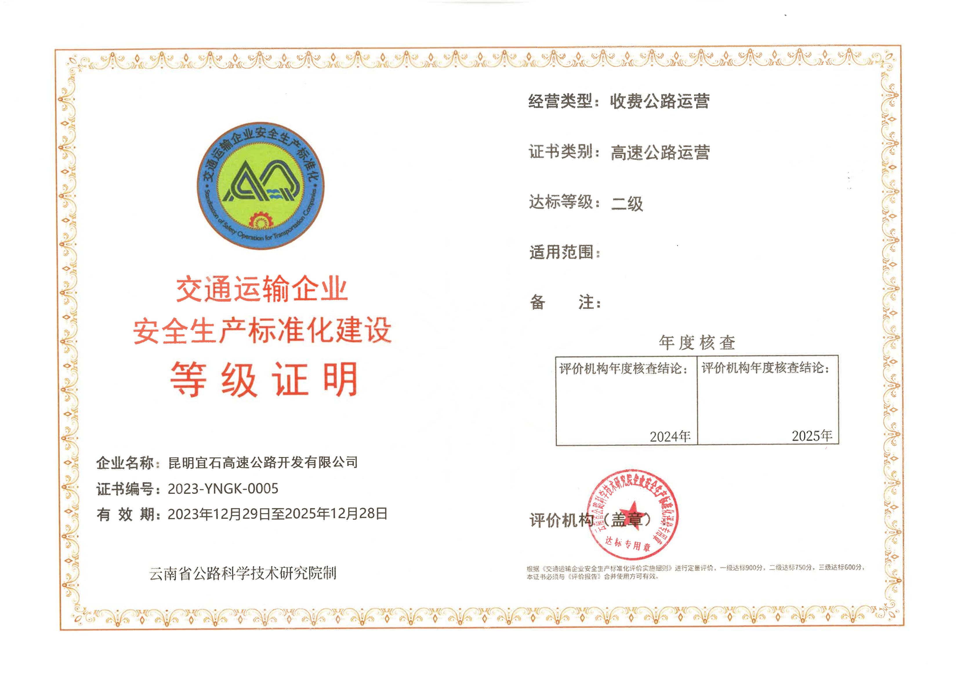 - 近日,宜石、石泸公司通过云南省公路科学技术研究院评审,达到高速公路运营企业安全生产标准化二级标准,并获得“高速公路运营企业安全生产标准化二级”证书。