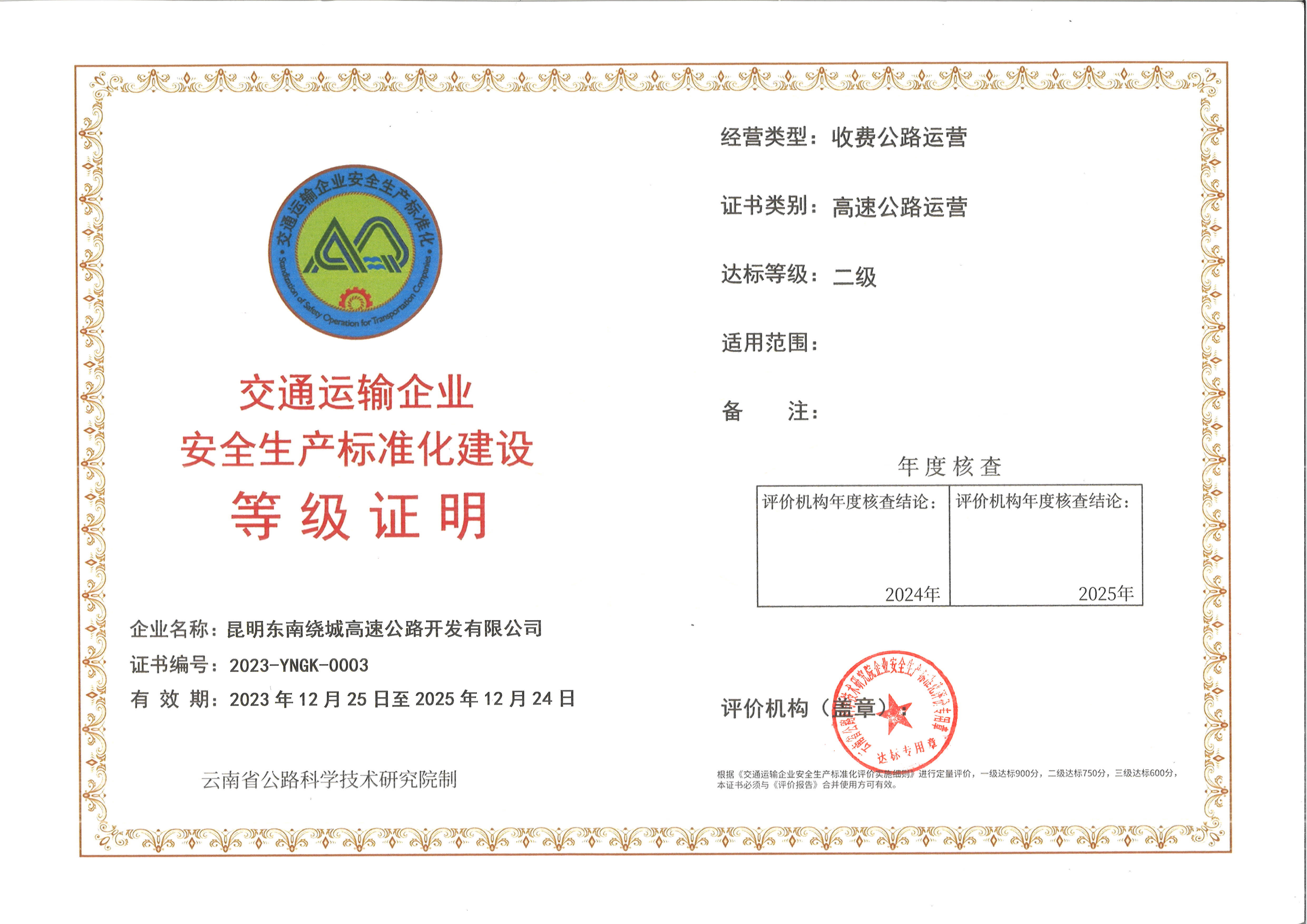 - 近日,365在线体育投注官网,beat365在线体育下属东南绕公司通过云南省公路科学技术研究院认证,于2023年12月25日取得“高速公路运营企业安全生产标准化二级”证书。 今年以来,东南...