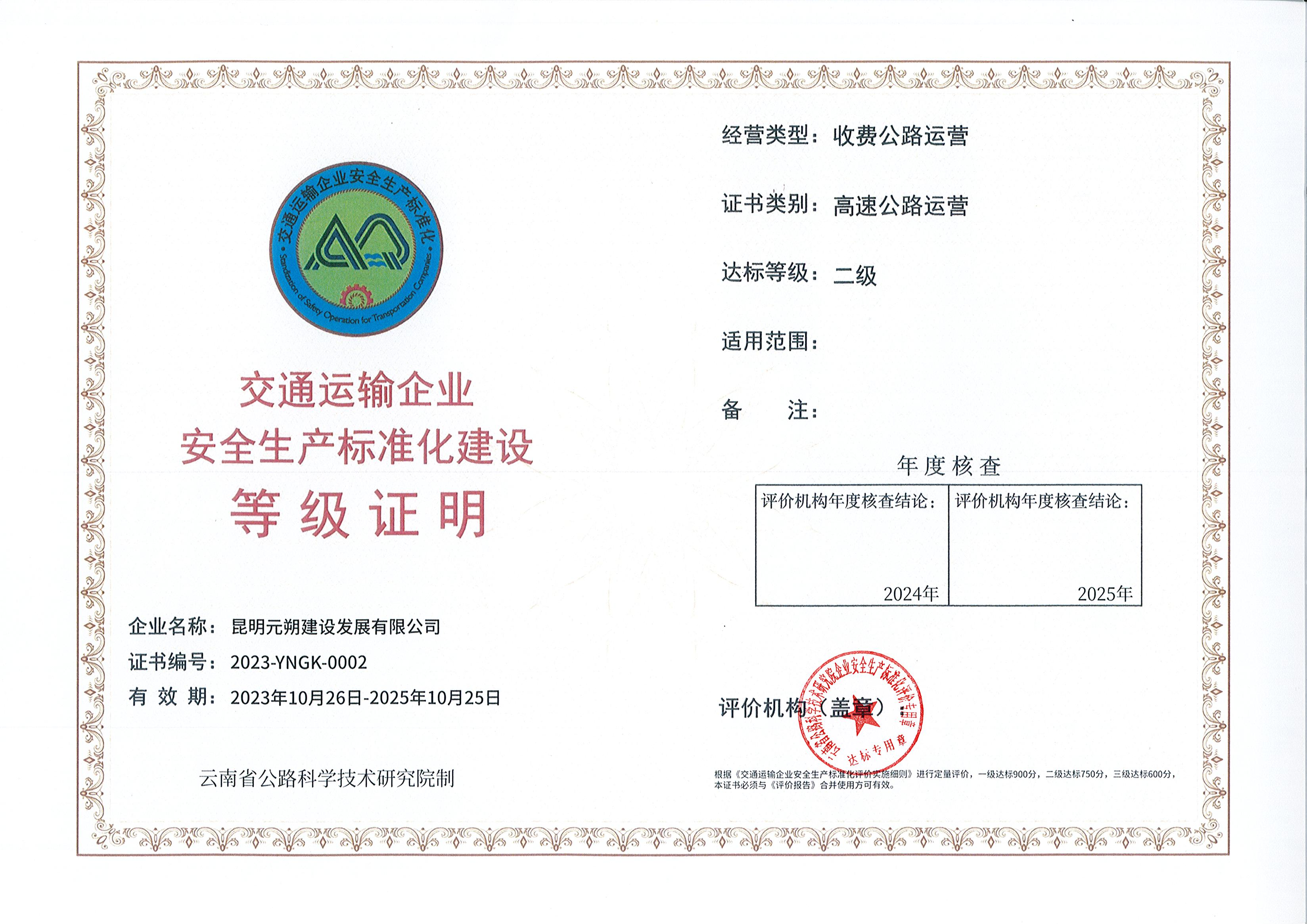- 近日,365在线体育投注官网,beat365在线体育下属元朔公司顺利通过云南省公路科学技术研究院审核认证,取得“高速公路运营安全生产标准化二级”证书。